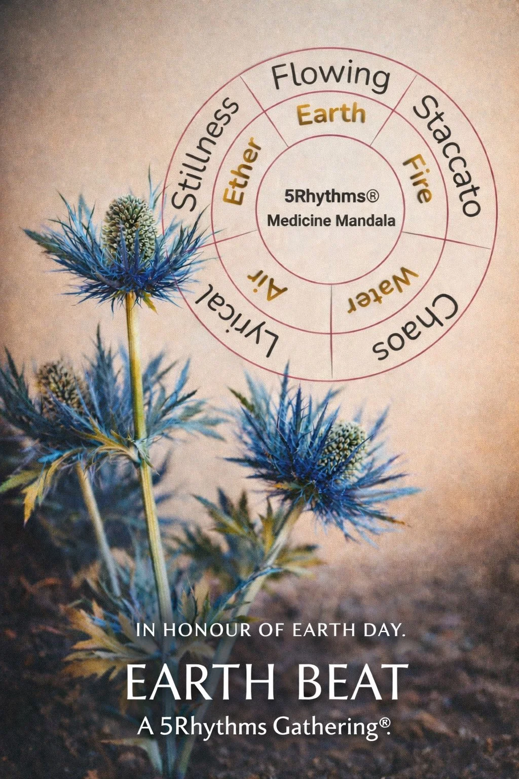 Earth Beat is a guided 5Rhythms® wave infused with somatic ritual, mantra, and embodied meditation. Together we’ll move through the map of the 5Rhythms — grounding, flowing, igniting, softening, and stilling — as a living expression of the elements.